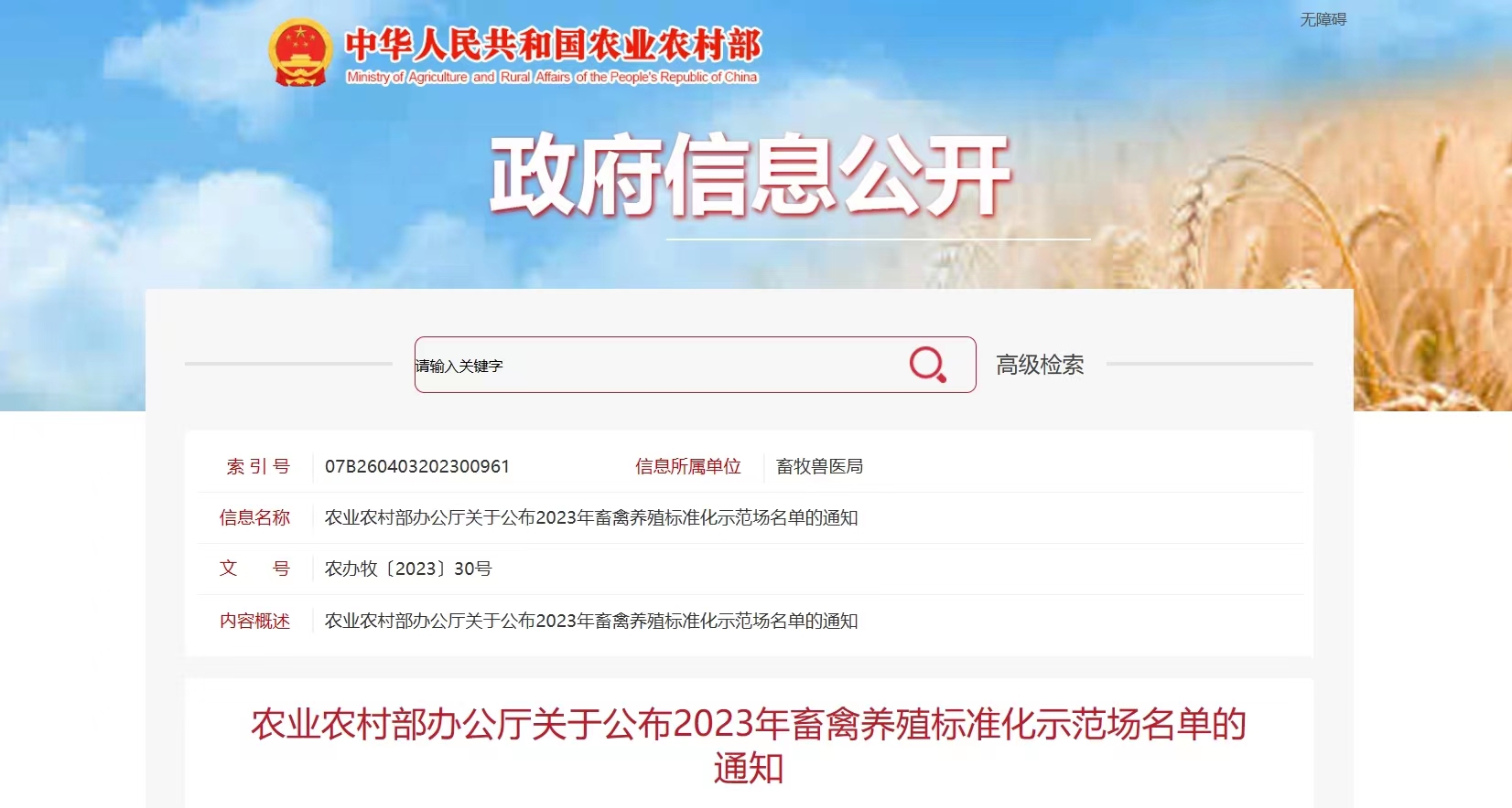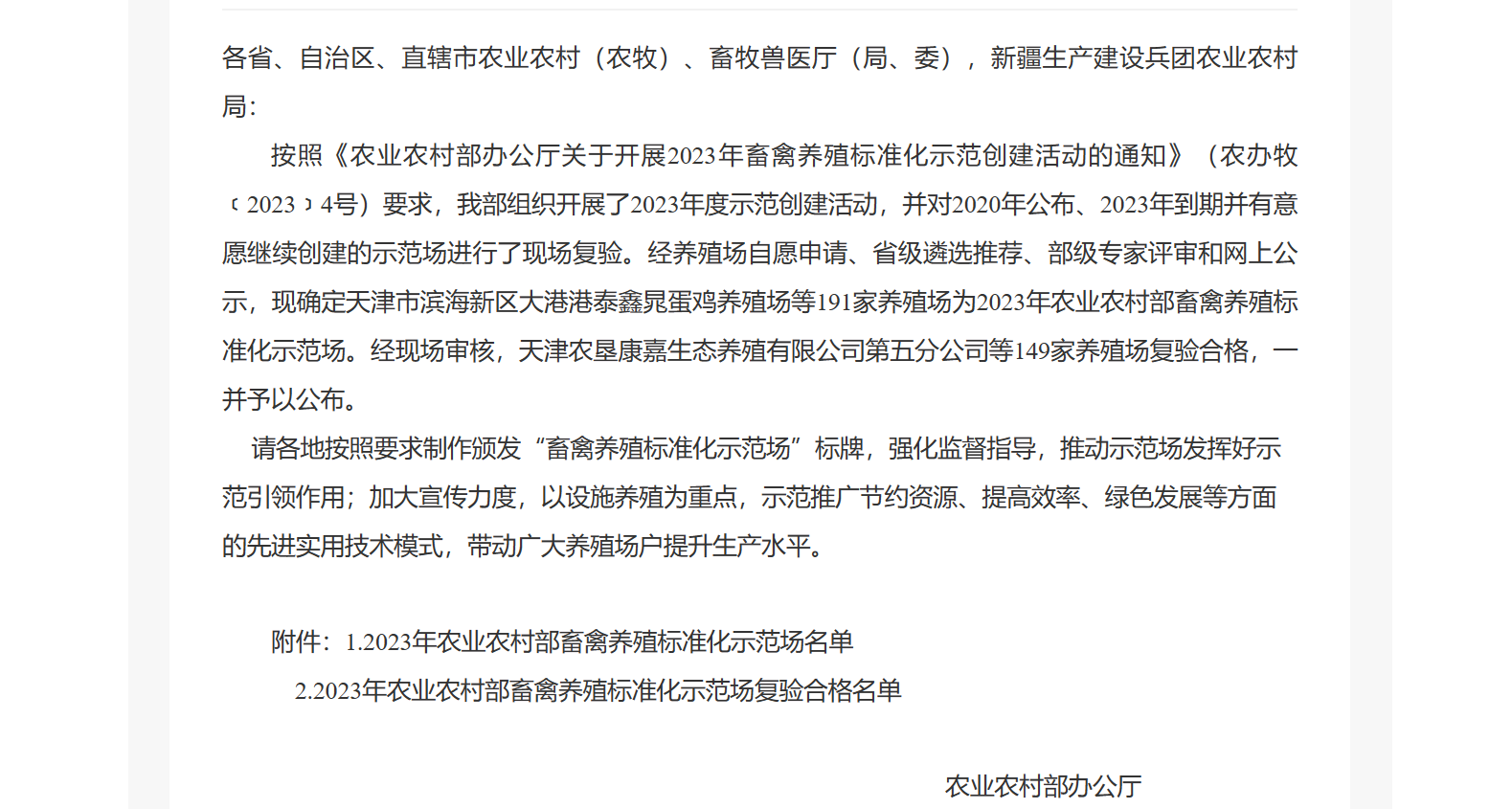 近日,農(nóng)業(yè)農(nóng)村部辦公廳公布了2023年全國191個畜禽養(yǎng)殖標準化示范場名單,鵬欣集團旗下鵬睿農(nóng)牧中陳核心育種場正式獲批部級畜禽養(yǎng)殖標準化示范場。